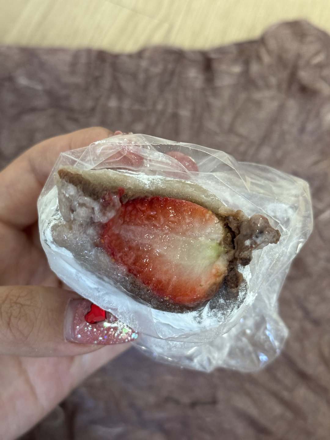 겉은 쫀득한 찹쌀피, 그 안엔 상큼한 생딸기가 통째로 박혀 있고,